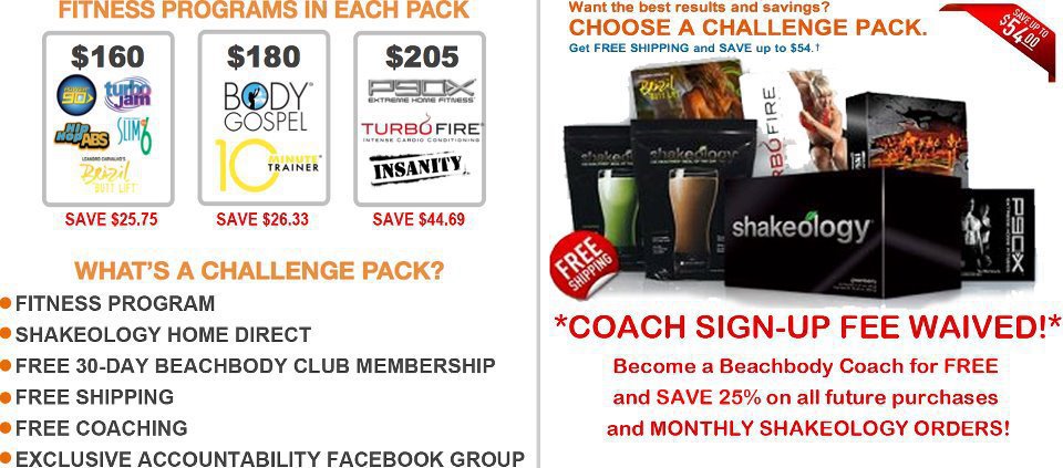 So here's the deal: Anyone who places an order of $100 or more (without taxes or shipping charges) will recieve a $25 Beachbody gift certificate for free! This offer is even valid on Challenge Packs which is awesome because the only thing that makes getting a great deal better is getting money back on top of it! All I ask is that if you give the Challenge Pack as a gift, you let me know so I can send you a letter to the recipient. I want to help them make sure that they stay on track as their coach and the letter will have information about how to get in touch with me and go through this program together! What's a Challenge Pack? Well since a picture is worth a thousand words....(click to enlarge)